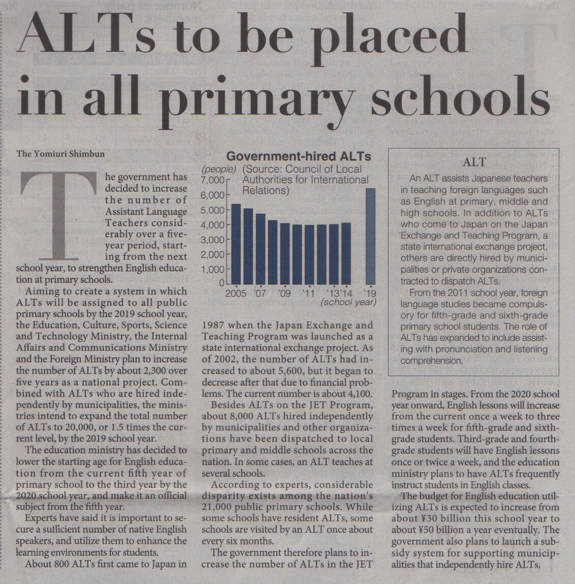 The Japanese government is planning to increase the number of Assistant Language Teachers (ALTs) to 20,000 by 2019. Although the acronym stands for any language by and large English is the only language that is taught in schools in Japan. Outsourcing has been the trend of late but this may mark the return of government-based selection as was the norm until the early 2000s.